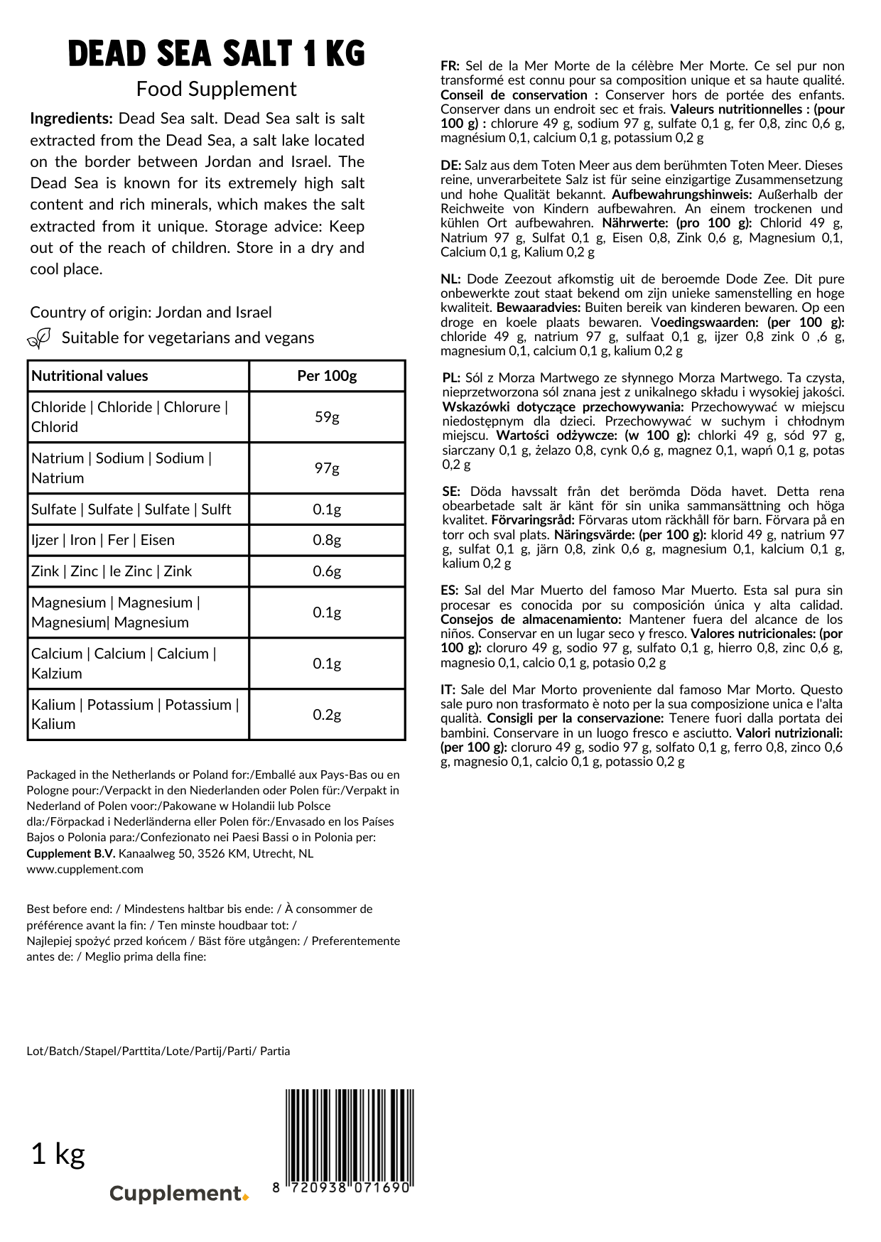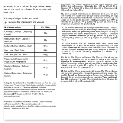 Unser Salz aus dem Toten Meer enthält viele Mineralien und ist eine gesündere Alternative zu Speisesalz. Das Salz aus dem Toten Meer enthält keine künstlichen Zusatzstoffe und ist daher die reinste Form von Salz aus dem Toten Meer.