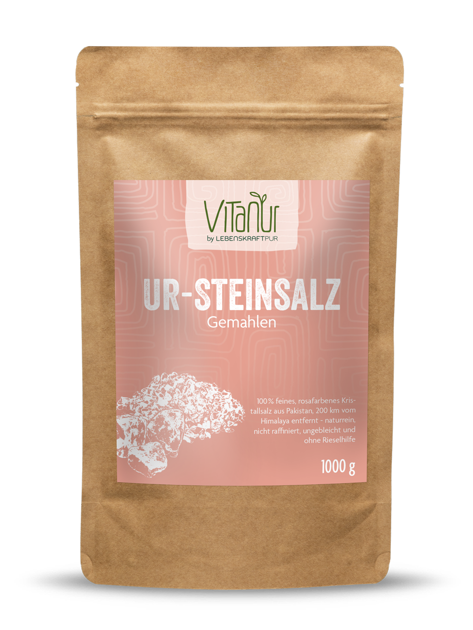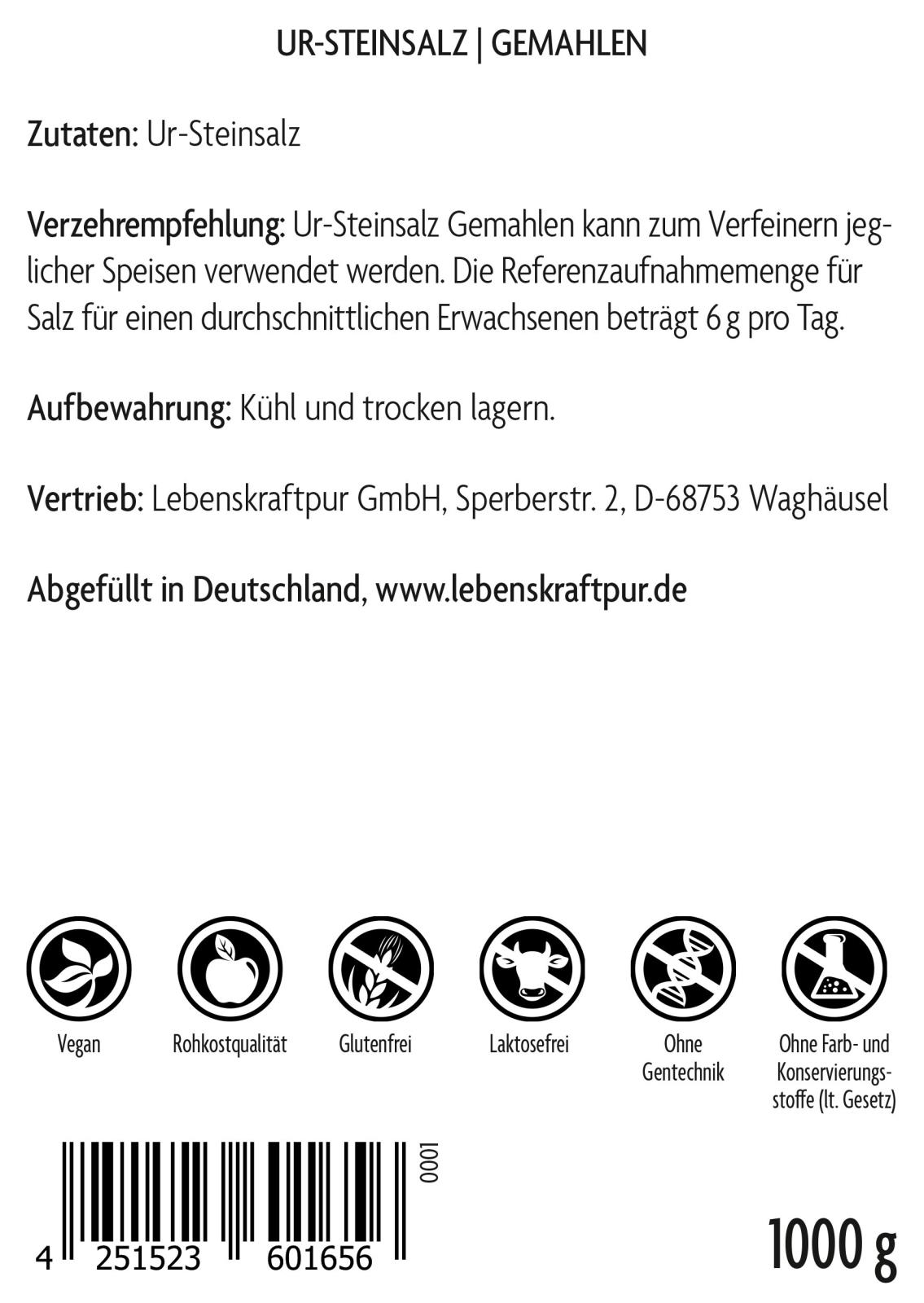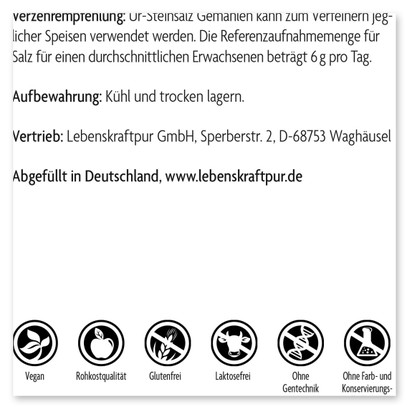 Das enthaltene Kristall- bzw. Steinsalz ist naturrein und wurde weder raffiniert und gebleicht noch beinhaltet es darüber hinaus Rieselhilfen oder andere Konservierungs- oder Zusatzstoffe. Ur-Steinsalz Gemahlen weist eine für Steinsalz feine Körnung auf, welche jedoch gröber ist als die von handelsüblichem Speisesalz. Diese gröbere Struktur verhindert ein Verklumpen der Salzkristalle, welche natürlicherweise Wasser aus der Luft aufnehmen (hygroskopische Eigenschaft). Dadurch kommt Ur-Steinsalz Gemahlen ohne Rieselhilfe aus und verklumpt dennoch kaum. Auch darüber hinaus ist das Kristall- bzw. Steinsalz naturrein, wurde weder raffiniert noch gebleicht und beinhaltet auch sonst keine Konservierungs- oder Zusatzstoffe. Das macht Ur-Steinsalz Gemahlen zu einem hochwertigen Speisesalz und damit wertvollen Lebensmittel.