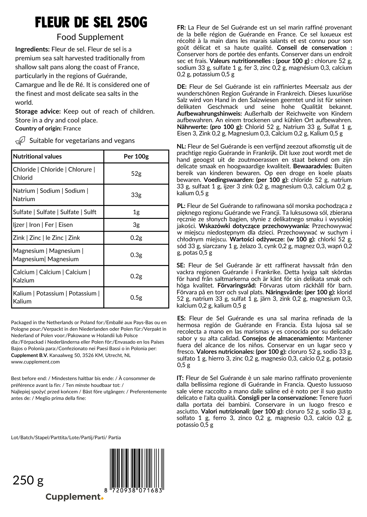 - Natürliche Mineralien: Fleur de Sel enthält viele natürliche Mineralien, darunter Magnesium, Kalzium, Kalium und Eisen. Diese Mineralien sind für verschiedene Körperfunktionen wie Muskelfunktion, Nervenleitung und Knochengesundheit unerlässlich.